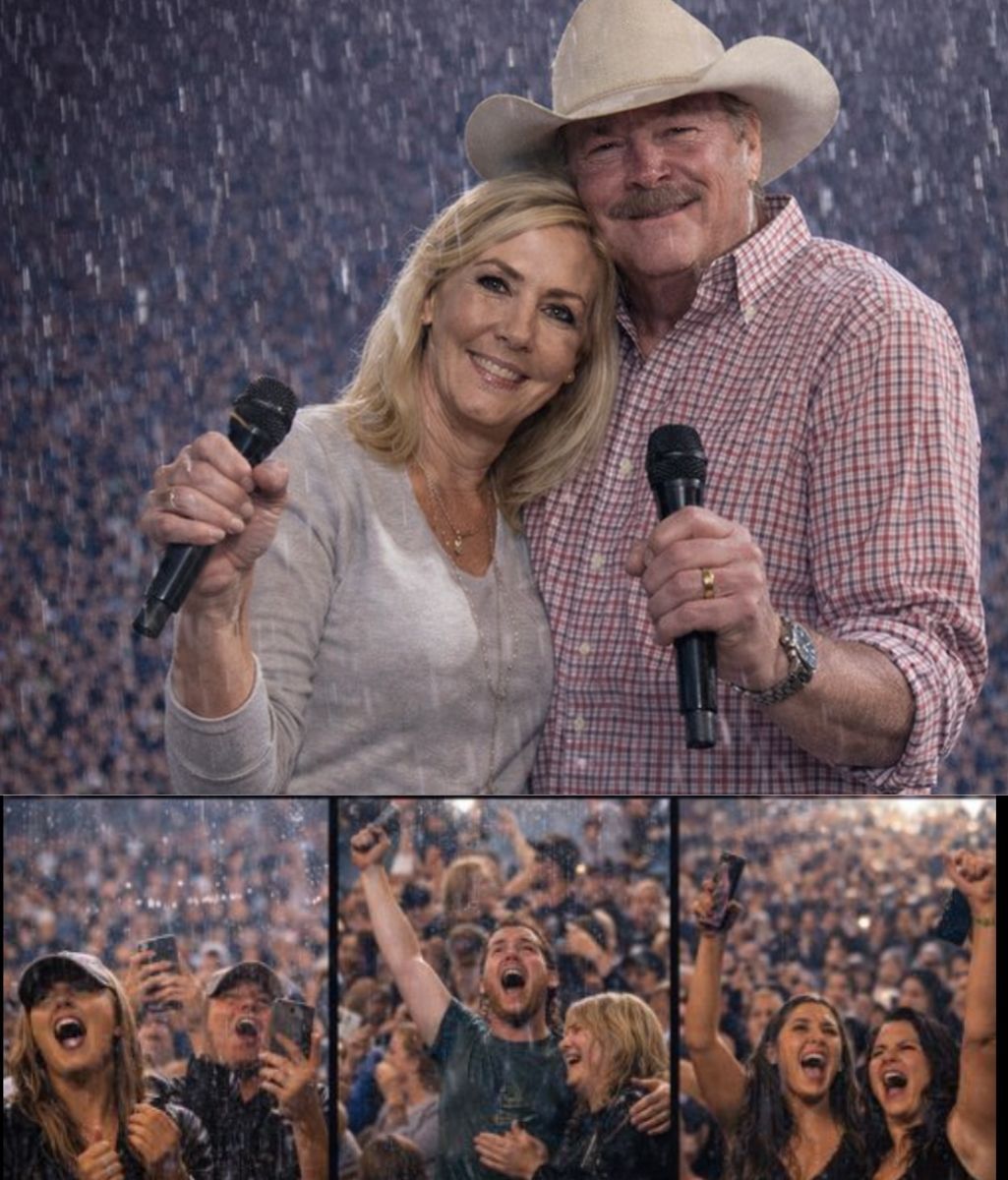 Last night delivered a moment that felt almost scripted by fate, yet unmistakably real. Under a dark sky and relentless rain, Alan Jackson stepped onto the stage and gave audiences something far greater than a performance. As the storm intensified, he welcomed his beloved wife, Denise Jackson, to join him for a duet that turned a difficult night into an unforgettable memory. What followed was not defiance of the weather, but transcendence of it.