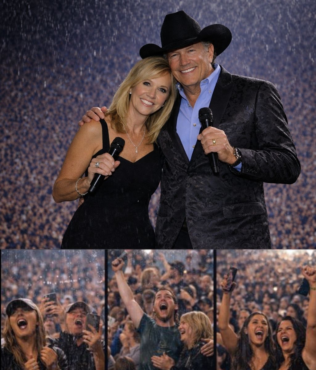 Last night delivered one of those moments that no rehearsal, no production meeting, and no forecast could ever plan. Under a relentless downpour, George Strait stepped onto the stage and transformed a storm-soaked evening into something quietly unforgettable. As rain poured down around him, he welcomed his beloved wife, Norma Strait, and together they shared a duet that made the weather feel suddenly irrelevant.
