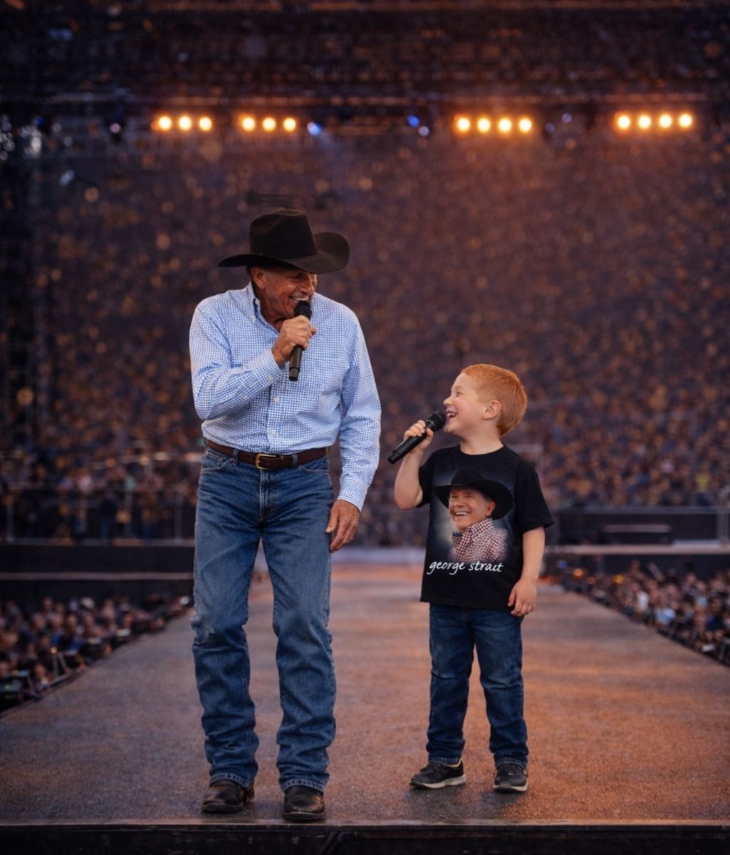 From the first notes, the atmosphere changed. The crowd, initially surprised, quickly fell into a deep, respectful silence. George Strait stood steady and familiar, a living symbol of country music’s enduring soul. Beside him, Harvey looked impossibly small against the vast stage, yet there was nothing hesitant about his presence. When the child began to sing, his voice — soft, clear, and unaffected — cut through the room with astonishing emotional force.