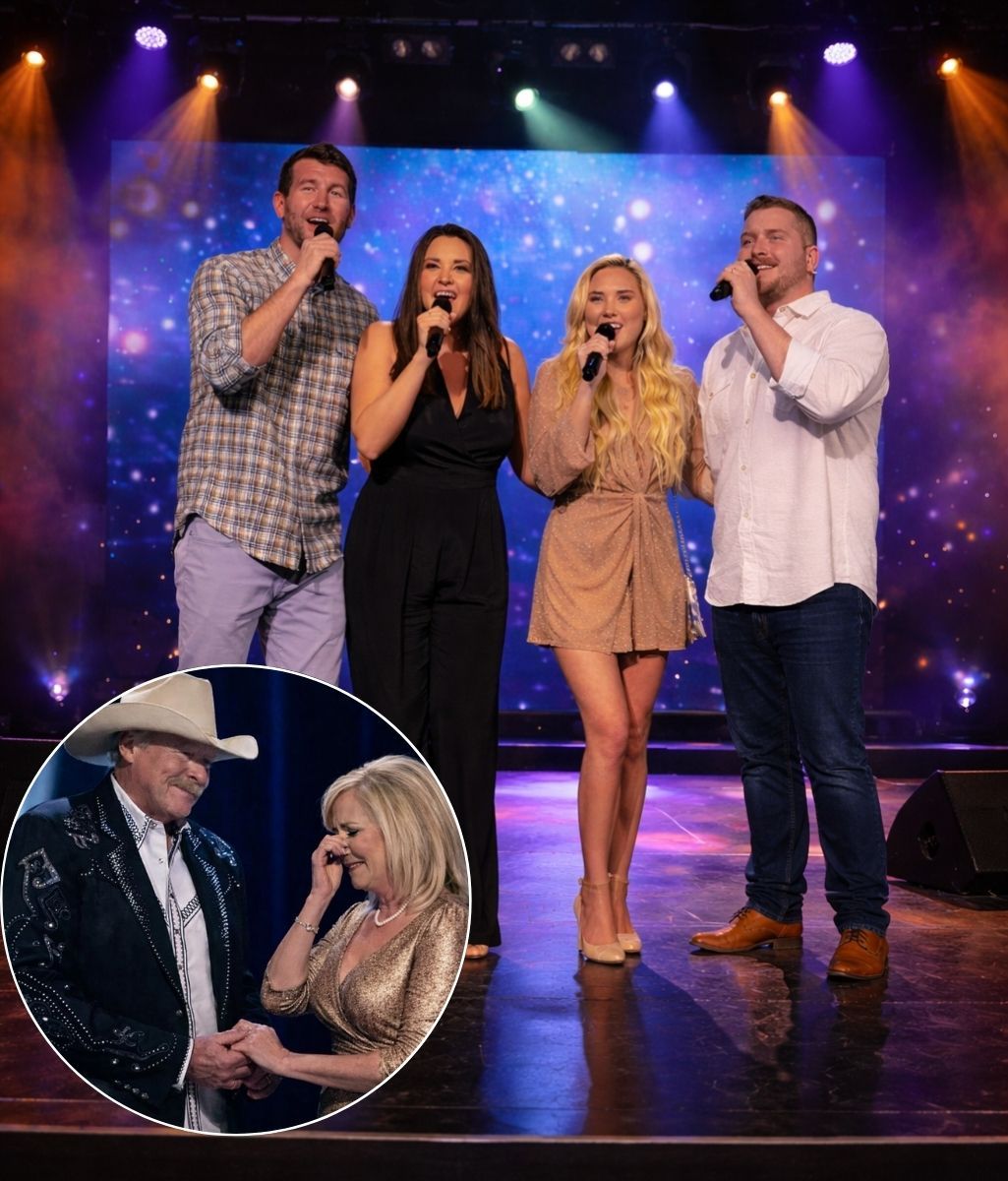 Last night delivered one of those rare moments that felt quietly historic — not because of spectacle, but because of sincerity. In a scene that no one in the audience could have anticipated, both daughters of Alan Jackson, joined by their husbands, stepped onto the stage together to perform Livin’ On Love. The song was offered as a heartfelt thank-you, not just to Alan, but to his wife, Denise Jackson, whose quiet strength has long been the foundation of the family’s story.