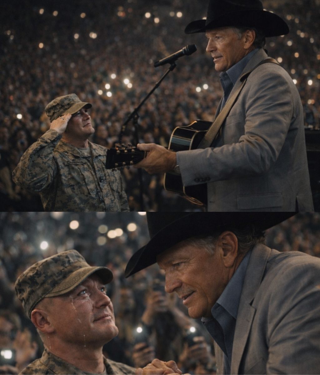 In the middle of a roaring crowd, during a night already charged with music and memory, something extraordinary happened — not because it was planned, but because it was felt. As the band played on, George Strait noticed a small, unmistakable gesture in the audience. A young soldier stood still, hand raised in salute.