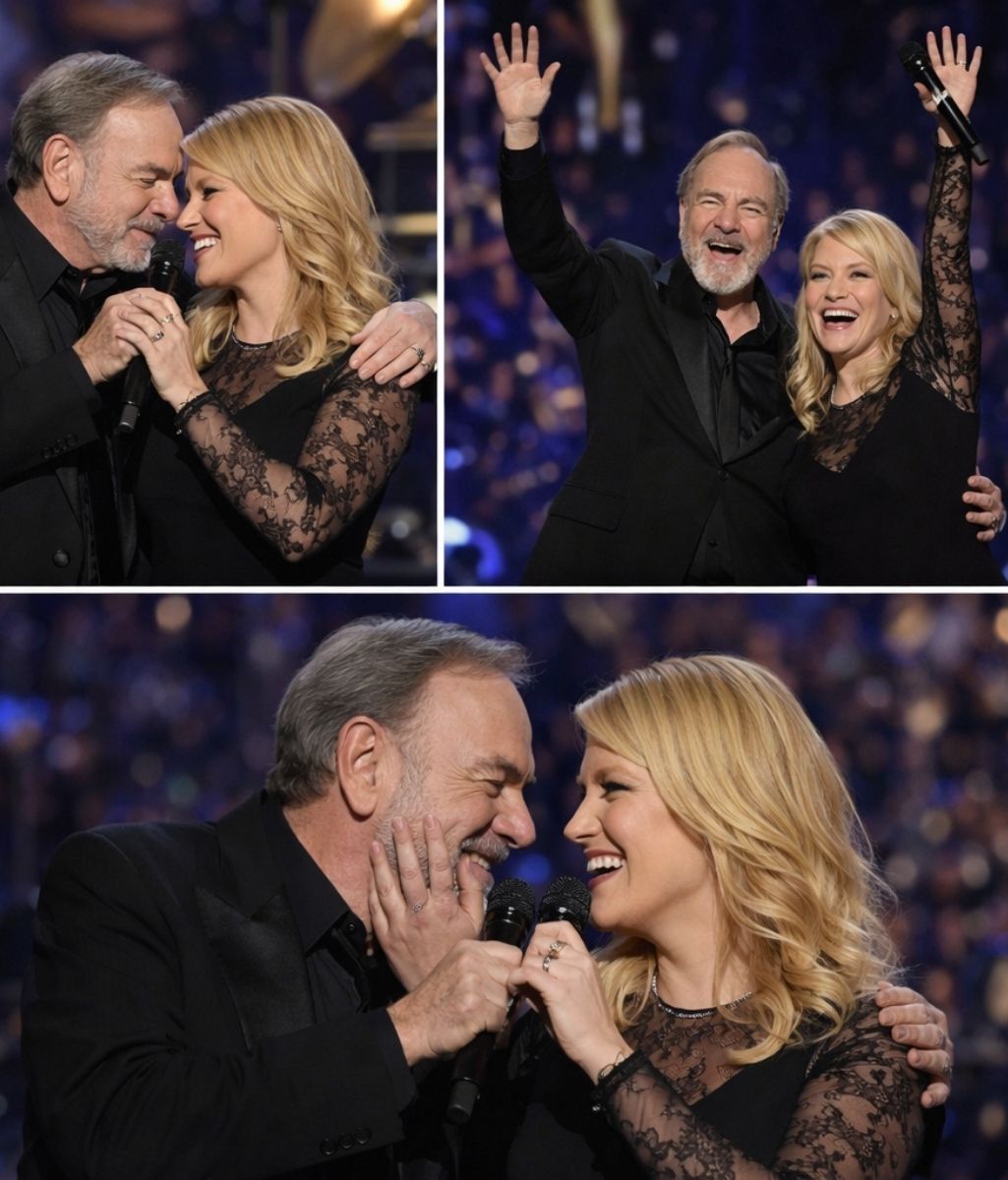 With a quiet gesture filled with tenderness, Neil Diamond reached out and invited his wife, Katie McNeil Diamond, onto the stage. The audience fell into a hushed silence, sensing that something deeply personal was about to unfold. Katie, visibly emotional, stepped beside him—not as a public figure, but as a partner sharing a moment that transcended the stage itself.