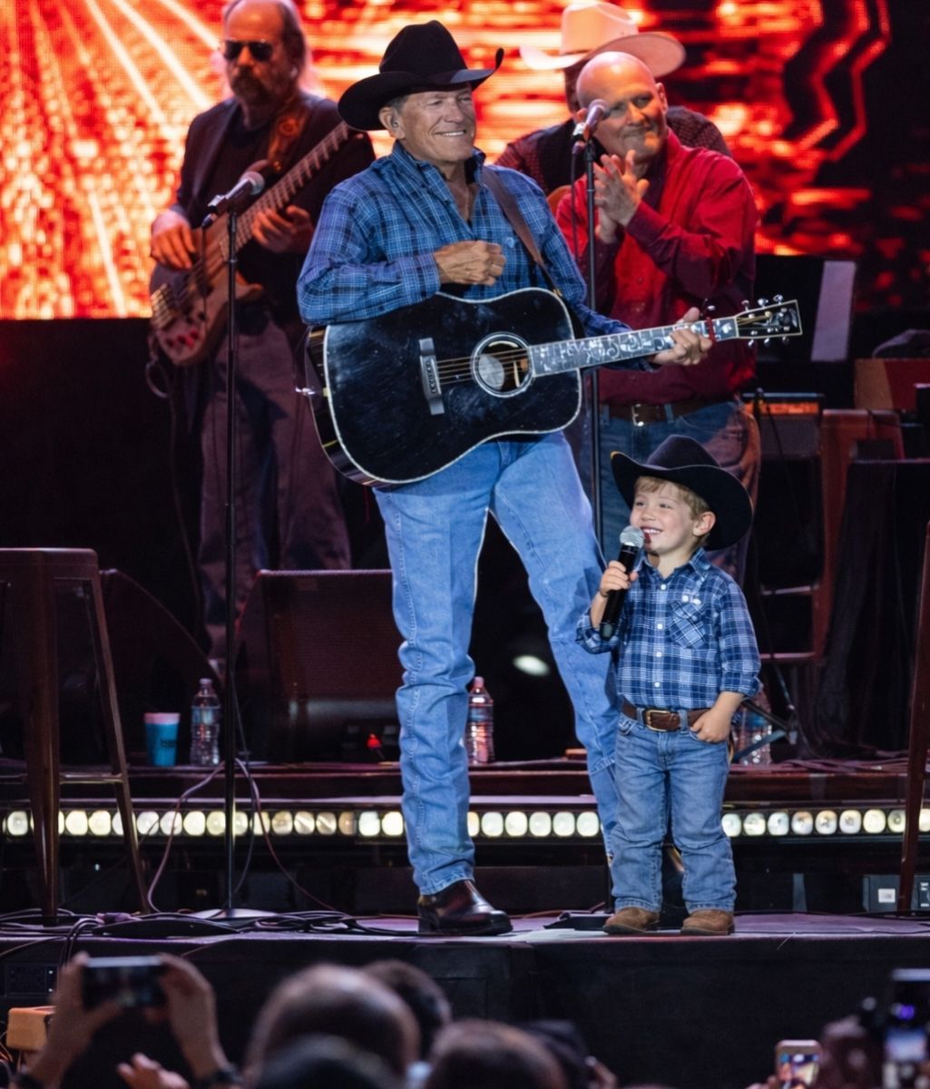 Last night at the Moody Center ATX, the stage became a place of quiet wonder rather than spectacle. When George Strait stepped into the light, the audience expected the calm authority that has defined his career for decades. What they did not expect was the presence of his grandson, Harvey, standing beside him—small in stature, steady in spirit, and ready to share a moment that would ripple far beyond the arena.