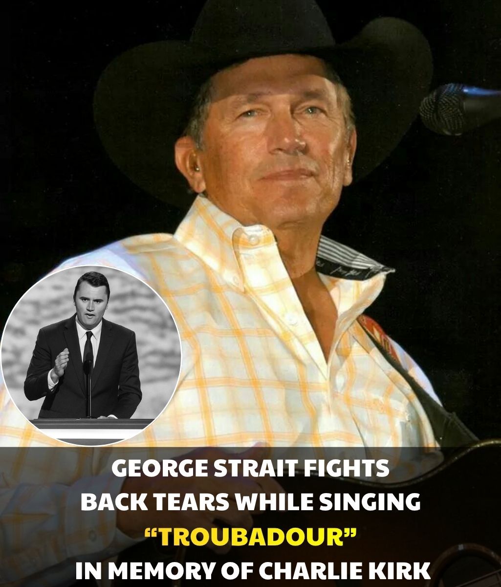 Under the soft glow of the spotlight, Strait began to sing “Troubadour,” his 2008 hit that has long stood as an anthem for humility, legacy, and the passage of time. But this time, the song carried a deeper weight. The performance was dedicated to Charlie Kirk, whose message of faith, patriotism, and perseverance inspired the evening’s theme of courage and conviction.