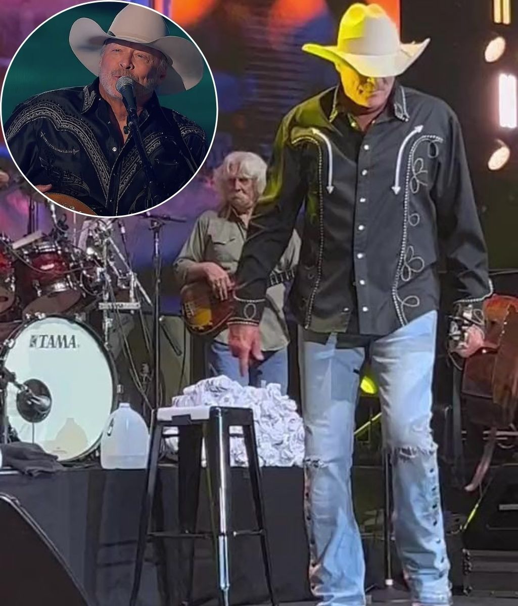 It began during “Remember When,” a song already wrapped in nostalgia and life’s bittersweet turns. Alan strummed through the first verse with that familiar gentleness, his vocals steady and warm. Then, just as the band prepared to ease into the chorus, he stepped back from the microphone.