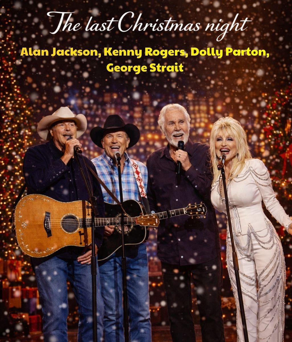Last night carried the weight of something final. The kind of night that doesn’t announce itself as historic, yet feels impossible to forget the moment it ends. On this final Christmas night, four names that shaped generations of country music were united in one place, one spirit, and one shared purpose: George Strait, Alan Jackson, Kenny Rogers, and Dolly Parton.